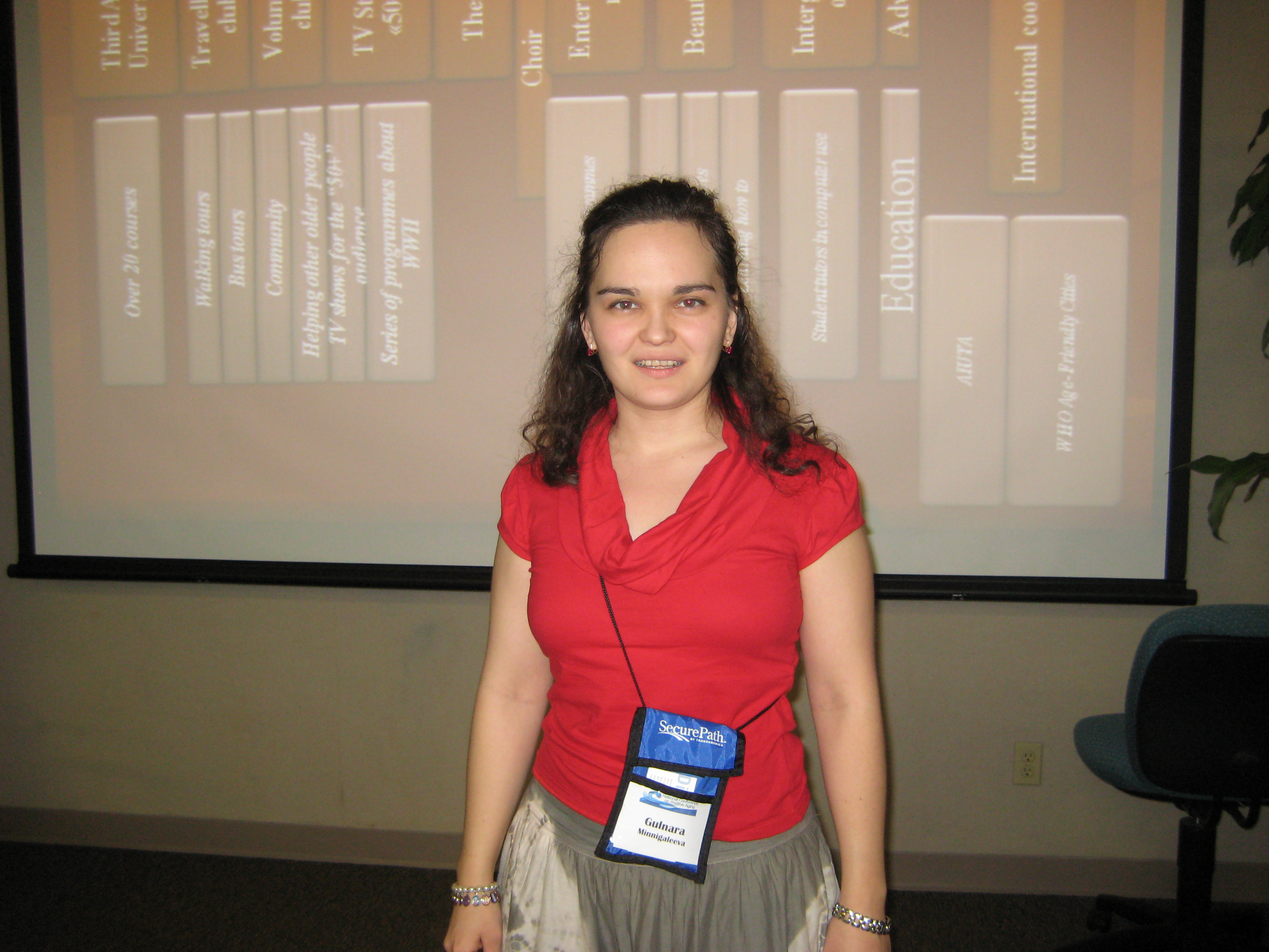 Гульнара Афрузовна выступила соведущим мастер-класса на тему «Работа и пенсионный возраст: современные тенденции в США и Европе». Ею были раскрыты особенности ситуации пожилых людей в России, трудности и позитивные тенденции в социальной политике в отношении пожилых в России, а также показан успешный опыт работы неправительственных организаций по активизации потенциала пенсионеров на примере Региональной общественной организации Республики Башкортостан КРЦП «Мои года – мое богатство».